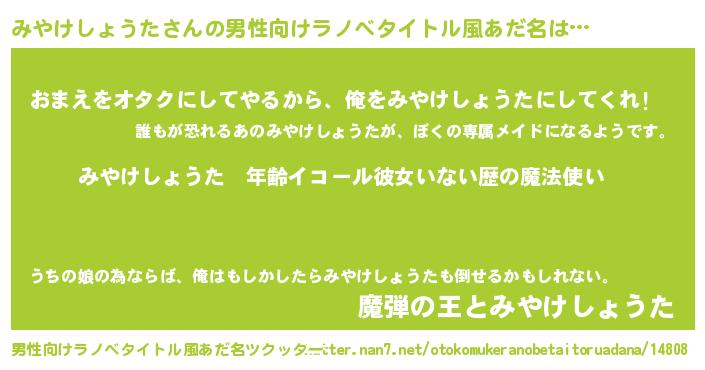 | 女子向けラノベタイトル風あだ名 | 『みやけしょうたの玉の輿計画!』 |