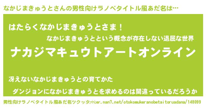 | 女子向けラノベタイトル風あだ名 | 『なかじまきゅうと姫と円卓の騎士』 |