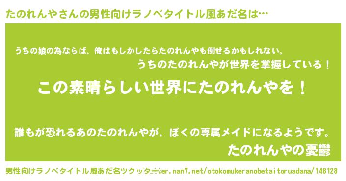 | 女子向けラノベタイトル風あだ名 | 『乙女ゲームの破滅フラグしかない悪役たのれんやに転生してしまった…』 |
