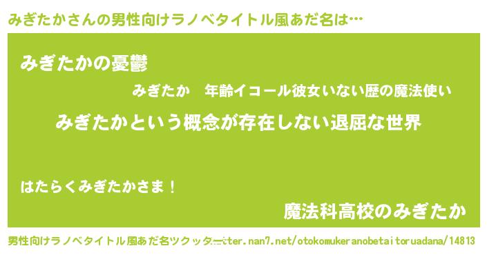 | 女子向けラノベタイトル風あだ名 | 『異世界で失敗しない100のみぎたか』 |