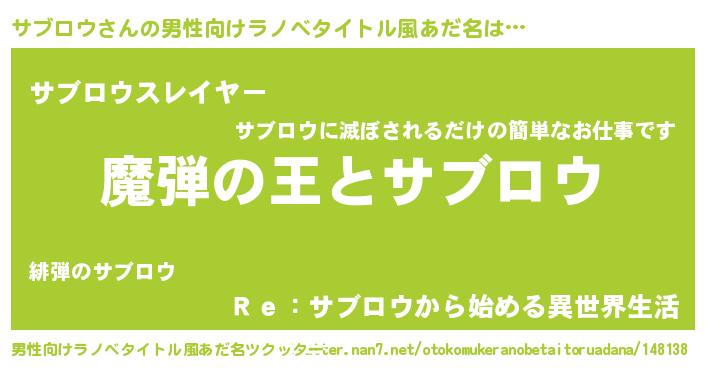 | 女子向けラノベタイトル風あだ名 | 『サブロウが死なない童話 林檎のサブロウの診療簿』 |