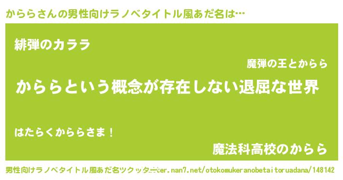 | 女子向けラノベタイトル風あだ名 | 『異世界で失敗しない100のからら』 |