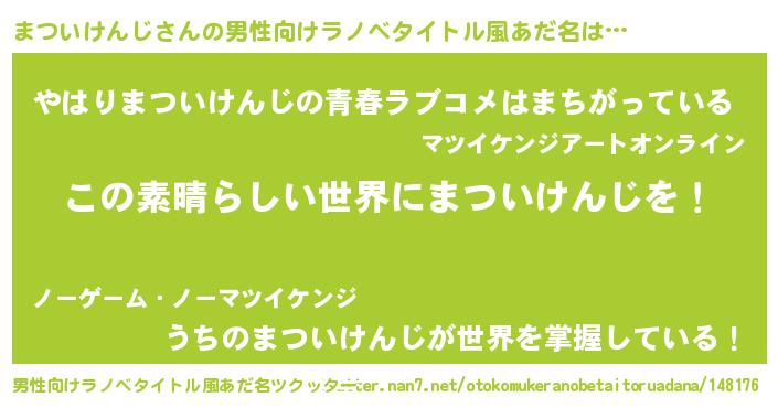 | 女子向けラノベタイトル風あだ名 | 『悪役まついけんじに転生したようですが、知った事ではありません』 |