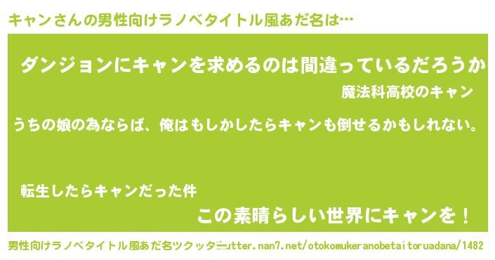 | 女子向けラノベタイトル風あだ名 | 『キャン伯爵の花嫁』 |