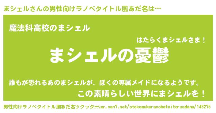 | 女子向けラノベタイトル風あだ名 | 『(仮)まシェルのやんごとなき事情』 |