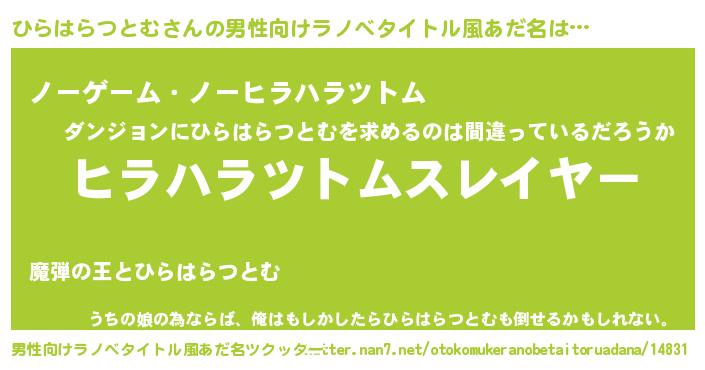 | 女子向けラノベタイトル風あだ名 | 『婚約破棄系悪役ひらはらつとむに転生したので、保身に走りました。』 |