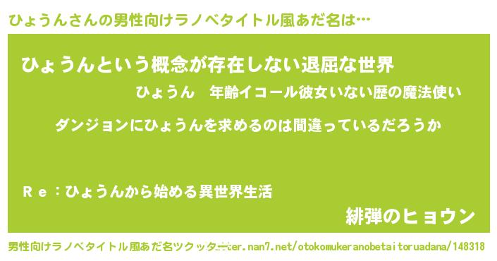 | 胡散臭い通販商品みたいなあだ名 | 『信頼と実績のサプリメント…その名も「ひょうん」』 |