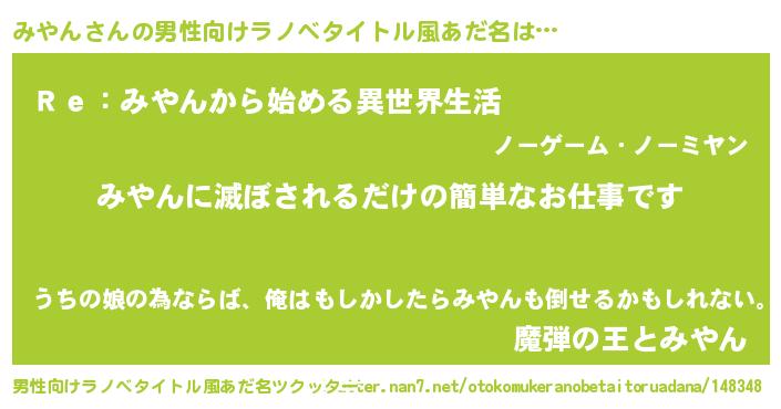 | 意味不明あだ名 | 『自称みやん』『住所不定無職みやん(10歳)』 |
