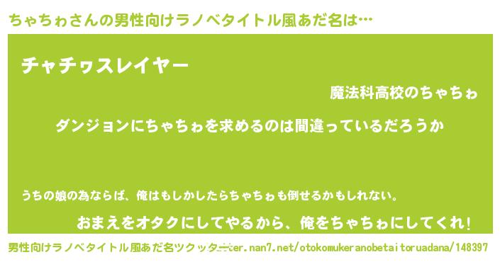 | 女子向けラノベタイトル風あだ名 | 『ちゃちゎの卵を拾いまして』 |