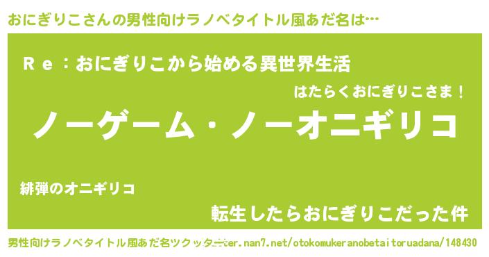 | 女子向けラノベタイトル風あだ名 | 『死神おにぎりこの再婚』 |