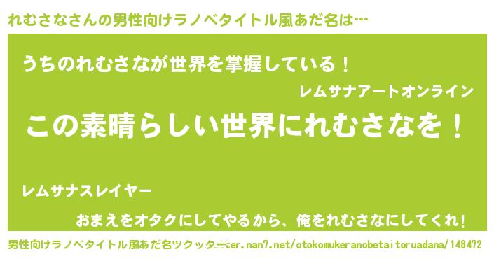 | 女子向けラノベタイトル風あだ名 | 『悪役れむさなに転生したようですが、知った事ではありません』 |