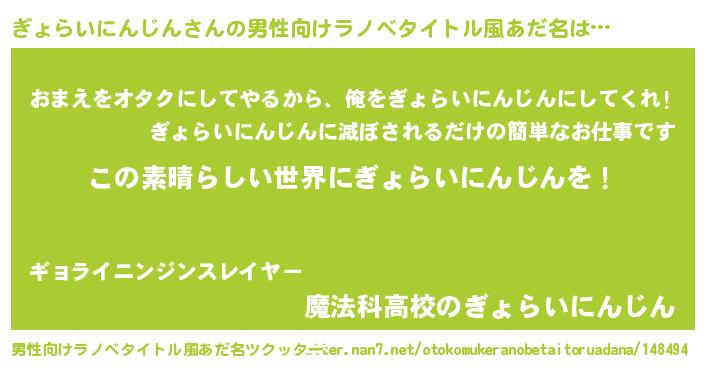 | 伝説のあだ名 | 『救世主となる錬金術士ぎょらいにんじん』 |