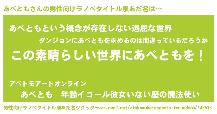 | 女子向けラノベタイトル風あだ名 | 『乙女ゲームの破滅フラグしかない悪役あべともに転生してしまった…』 |