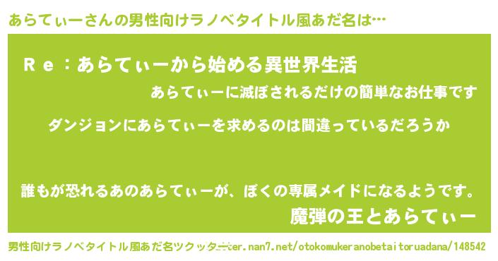 | 女子向けラノベタイトル風あだ名 | 『あらてぃーの卵を拾いまして』 |