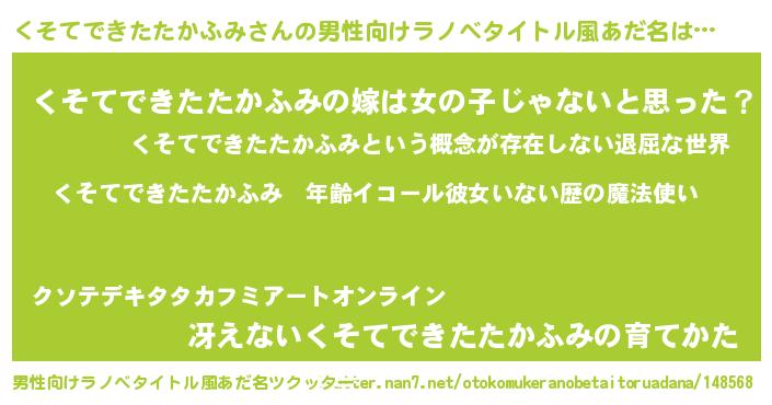 | 女子向けラノベタイトル風あだ名 | 『くそてできたたかふみの玉の輿計画!』 |