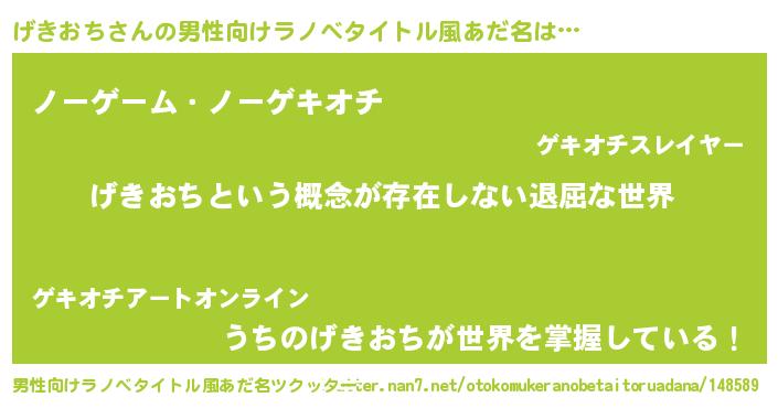 | 女子向けラノベタイトル風あだ名 | 『異世界で失敗しない100のげきおち』 |