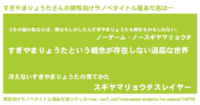 | 女子向けラノベタイトル風あだ名 | 『異世界で失敗しない100のすぎやまりょうた』 |