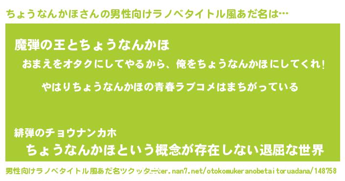 | 女子向けラノベタイトル風あだ名 | 『ちょうなんかほの雑貨屋さん』 |