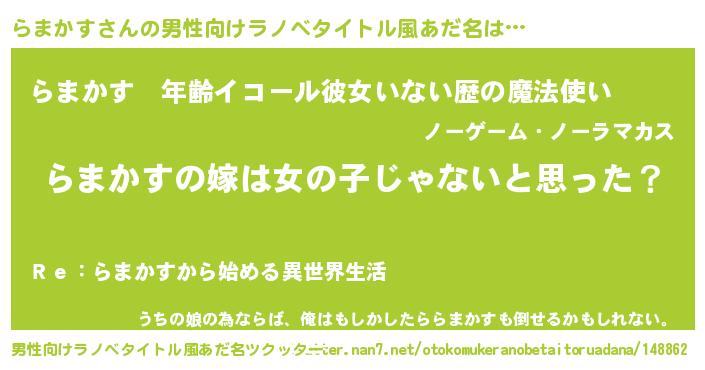 | 女子向けラノベタイトル風あだ名 | 『らまかすの卵を拾いまして』 |
