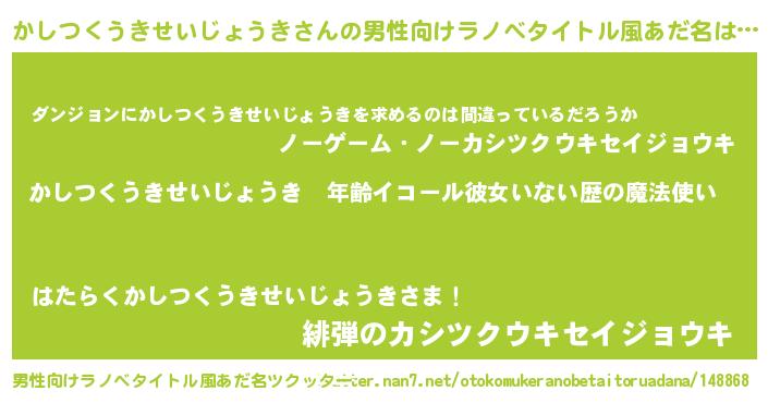| 女子向けラノベタイトル風あだ名 | 『かしつくうきせいじょうきの玉の輿計画!』 |