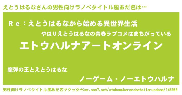 | 胡散臭い通販商品みたいなあだ名 | 『億万長者になれる霊験あらたかなお札…その名も「えとうはるな」』 |