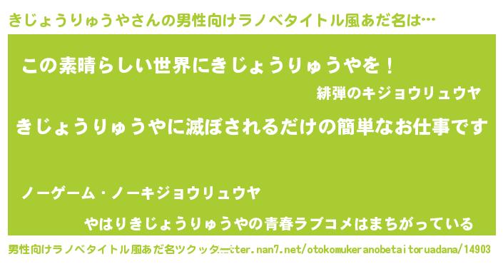 | 意味不明あだ名 | 『住所不定無職きじょうりゅうや(2歳)』 |
