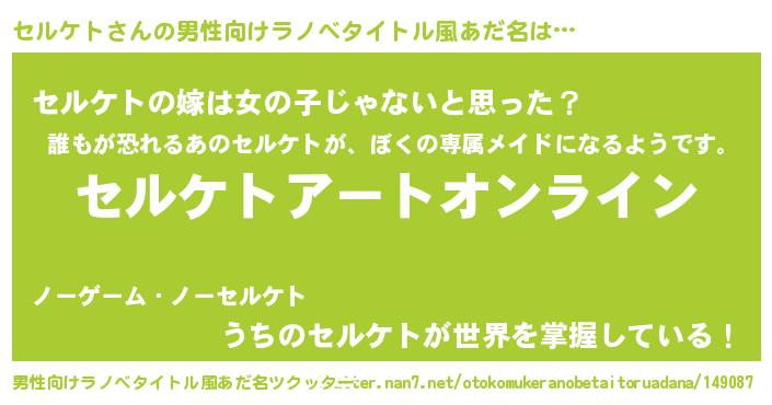 | 女子向けラノベタイトル風あだ名 | 『誰かこのセルケトを説明してください! ~契約から始まるウェディング~』 |