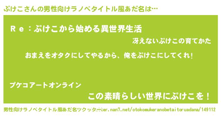 | 女子向けラノベタイトル風あだ名 | 『ぷけこ夫妻のなれそめ』『闇のぷけこ』 |