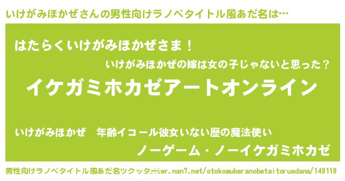 | 女子向けラノベタイトル風あだ名 | 『誰かこのいけがみほかぜを説明してください! ~契約から始まるウェディング~』 |