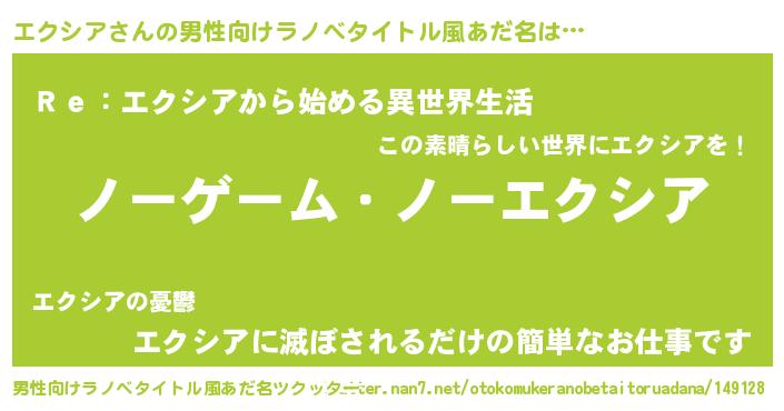 | 女子向けラノベタイトル風あだ名 | 『死神エクシアの再婚』 |