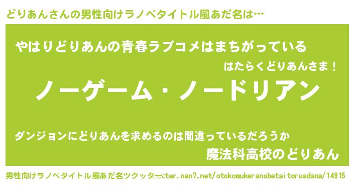 | 女子向けラノベタイトル風あだ名 | 『死神どりあんの再婚』 |