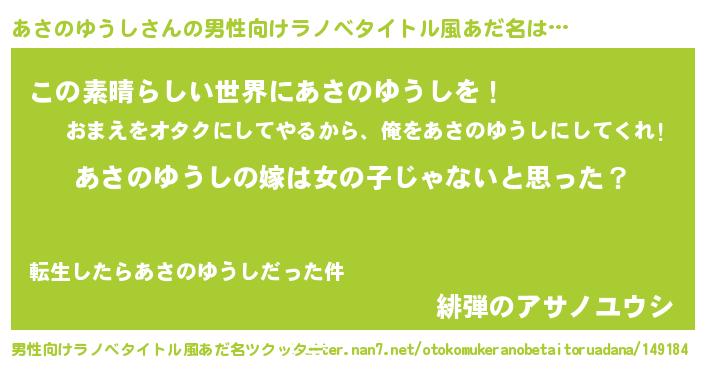 | 女子向けラノベタイトル風あだ名 | 『あさのゆうしの卵を拾いまして』 |