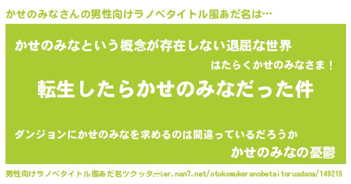 | 女子向けラノベタイトル風あだ名 | 『かせのみなの玉の輿計画!』 |