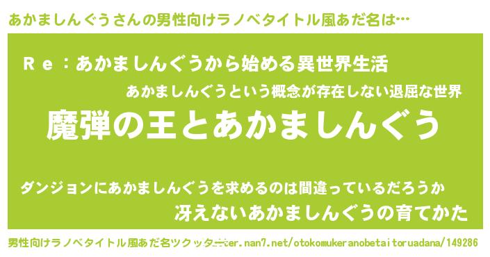 | 女子向けラノベタイトル風あだ名 | 『あかましんぐうが死なない童話 林檎のあかましんぐうの診療簿』 |