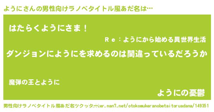 | 女子向けラノベタイトル風あだ名 | 『ようにの卵を拾いまして』『闇のように』 |