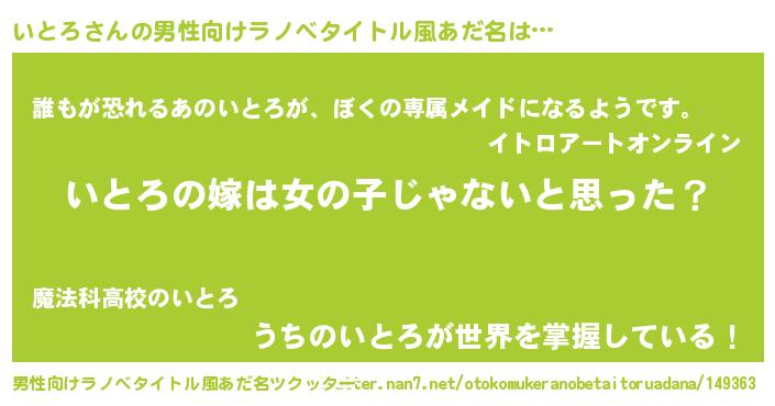| 女子向けラノベタイトル風あだ名 | 『いとろの卵を拾いまして』 |