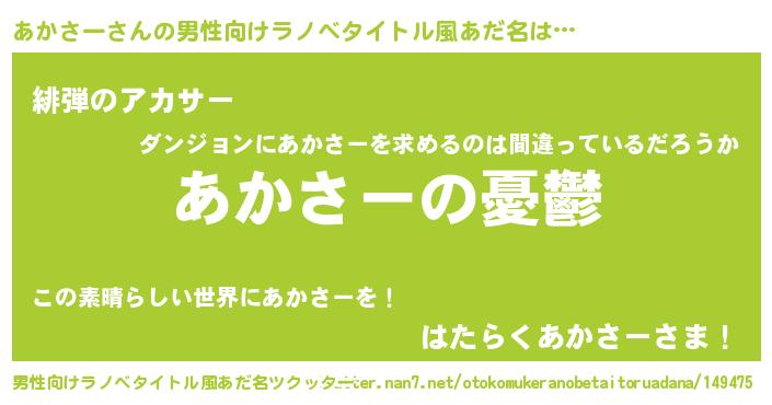 | 女子向けラノベタイトル風あだ名 | 『(仮)あかさーのやんごとなき事情』 |
