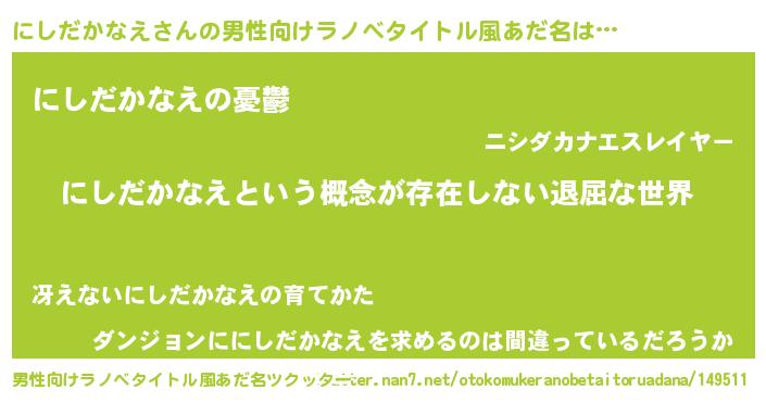 | 女子向けラノベタイトル風あだ名 | 『異世界で失敗しない100のにしだかなえ』 |