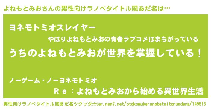 | ロボットアニメ | 搭乗するロボットの名前『マクロシュよねもとみお初号機』 |