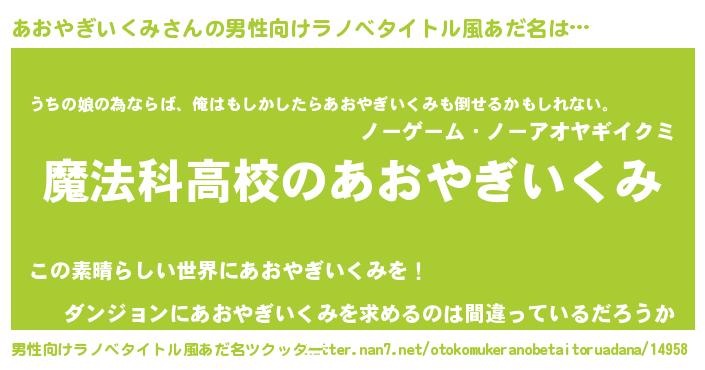 | 女子向けラノベタイトル風あだ名 | 『あおやぎいくみなんてお断りですっ。』 |