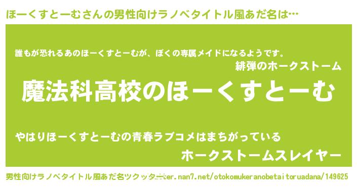 | 女子向けラノベタイトル風あだ名 | 『ほーくすとーむなんてお断りですっ。』 |