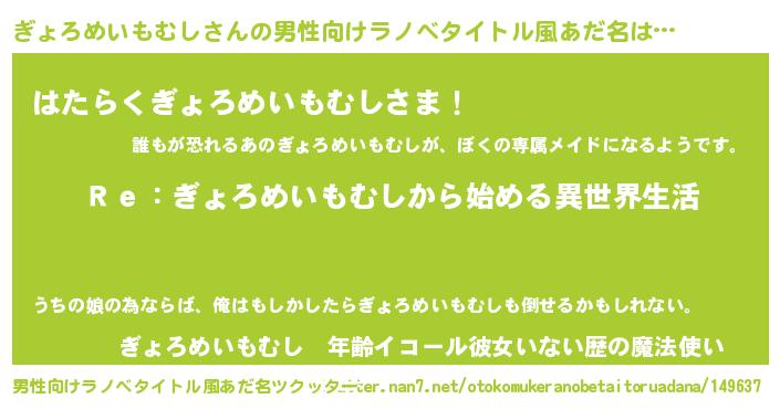 | 女子向けラノベタイトル風あだ名 | 『ぎょろめいもむしストレイドッグス』 |