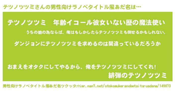 | 女子向けラノベタイトル風あだ名 | 『テツノツツミは平凡を望む』 |