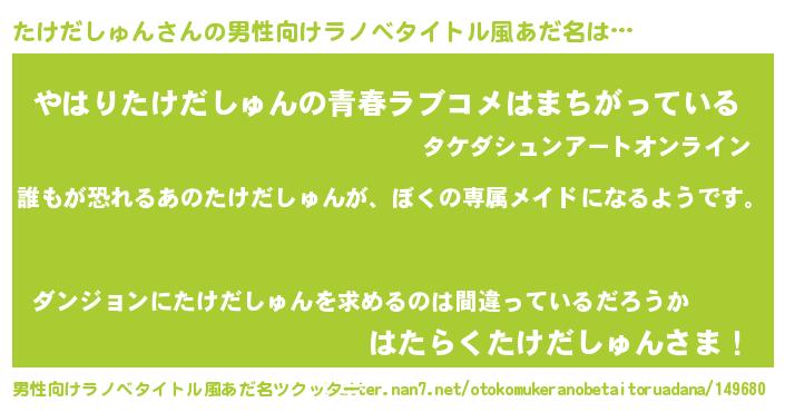 | 女子向けラノベタイトル風あだ名 | 『異世界でカフェたけだしゅんを開店しました。』 |