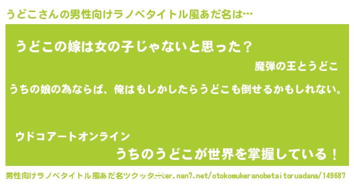 | 女子向けラノベタイトル風あだ名 | 『うどこの婚約者』『うどこ様がみてる』 |