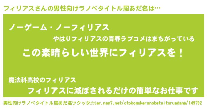 | 女子向けラノベタイトル風あだ名 | 『悪役フィリアスに転生したようですが、知った事ではありません』 |
