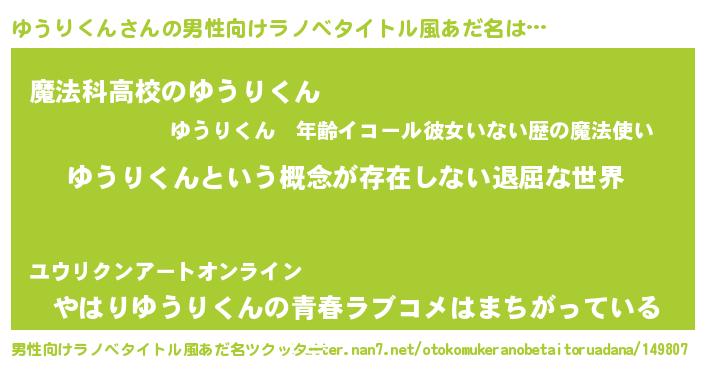 | 女子向けラノベタイトル風あだ名 | 『異世界で失敗しない100のゆうりくん』 |
