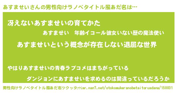| 女子向けラノベタイトル風あだ名 | 『異世界で失敗しない100のあすませい』 |