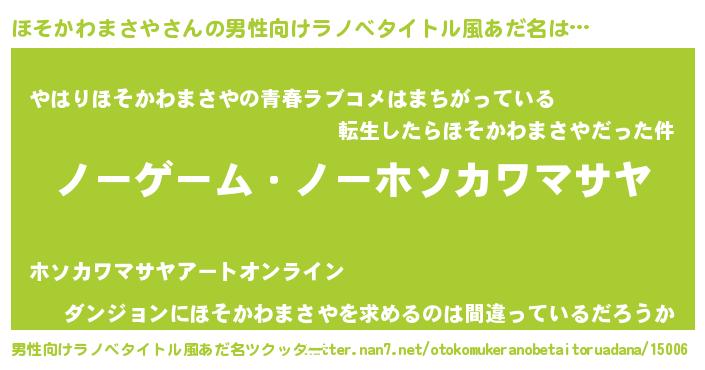 | 女子向けラノベタイトル風あだ名 | 『死神ほそかわまさやの再婚』 |