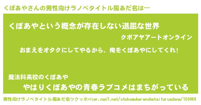 | 女子向けラノベタイトル風あだ名 | 『くぼあや夫妻のなれそめ』 |